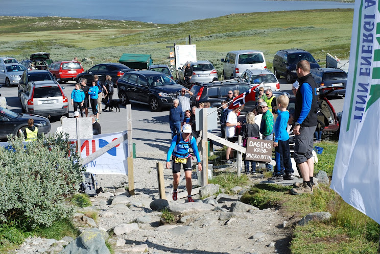 Alex wartet alle zwei Kilometer auf mich mit Wasser und Cola. Der Magen ist zu dem Zeitpunkt nicht mehr willens, noch was an Gel aufzunehmen und so steige ich bei Kilometer 10 auf Cola um. Trotzdem muss ich bis Kilometer 25 noch zweimal ins Gebüsch. Bei Kilometer 19 sehe ich endlich den Gipfel! Ich bin froh, dass es in Rjukan dann endlich rauf geht. Ich trippel-jogge den Anstieg rauf. Und Alex steht nach wie vor alle 1-2km am Rand und wartet. Ich erlaube mir eine kurze Gehpause, dann laufe ich weiter. Bei Kilometer 28 rum fragt er, ob ich wissen will, wo ich liege. "Ist das interessant?" frage ich. Erst da erfahre ich, dass ich in Führung liege. Tief durchatmen und weitermachen! Ich arbeite mich in 5km Schritten Richtung Gipfel - dabei überhole ich einige spazierengehende Athleten. Endlich, Kilometer 32,5!